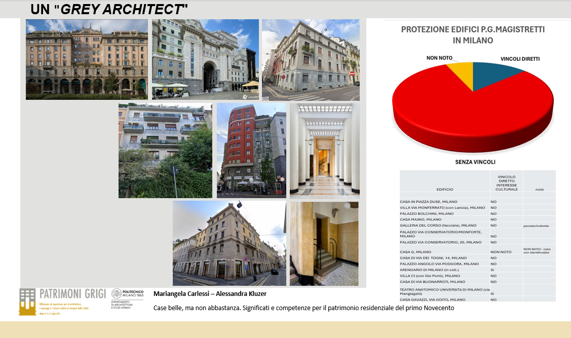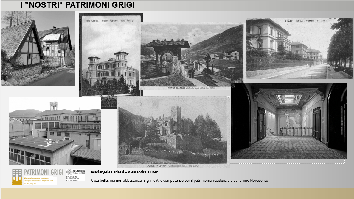 Partecipazione al convegno dedicato ai “Patrimoni grigi”, ossia a tutto quel patrimonio costruito che sfugge alla tutela istituzionale e che, pur racchiudendo molteplici significati e valori anche formali, è vulnerabile a processi di distruzione o massiccia trasformazione. Il nostro contributo ha riguardato una vasta e poliedrica famiglia di architetture “grigie”: il patrimonio residenziale tra Otto e Novecento, così caratterizzante sia il paesaggio urbano che i contesti periurbani e, soprattutto, della nascente villeggiatura